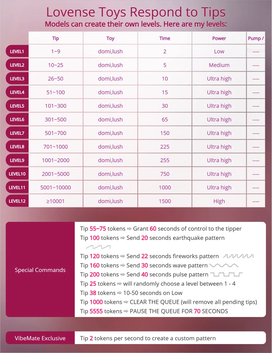 口交, 狗爬式, 假陽具或按摩棒, 髒話, 深喉, 淋浴, 無上裝, 脫衣舞, 皮帶, 潮吹, 指交, 扭扭樂, 吸煙, 高跟鞋, 自慰, 乳頭玩具, 精油表演, 情色舞蹈, 羞辱, 堵嘴, 乳膠, 撸管指導, 69種姿勢, 情境扮演, 打屁股, 性愛玩具, 乳交, 女牛仔, 阿嘿顏, 駱駝趾, 老二評分, 打飛機, 絲襪, 性高潮